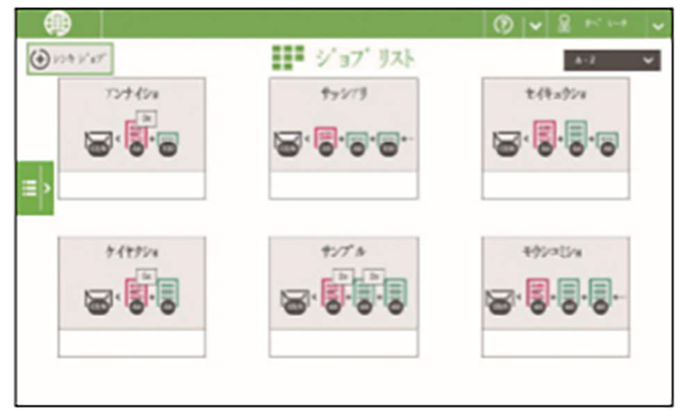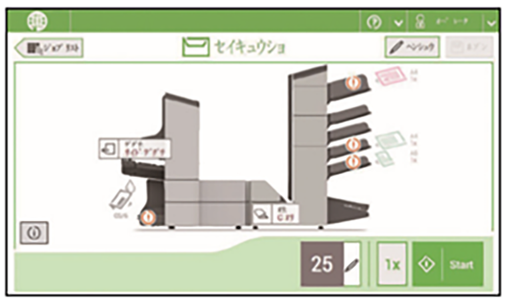 - ジョブ選択後、自動で用紙の有無をチェックします。 書類の積載フィーダーを指定し、書類が正しく積載されない場合は、どのフィーダーに問題があるかを画面に表示します。そのため、ジョブが正しく設定され、作業されているかをシステムが常にサポートしてくれます。