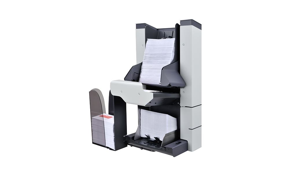 - 書類セットの厚みまたは読取マークなどに基づいて、2ヵ所の出口に自動的に仕分ける事ができます。また、独自のパワースタッカーにより、封入済み封筒を簡単に取り出す事ができます。
