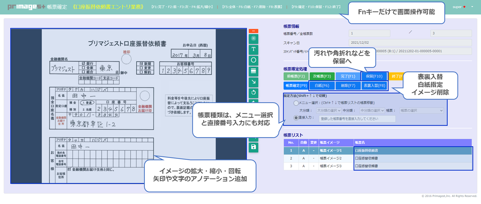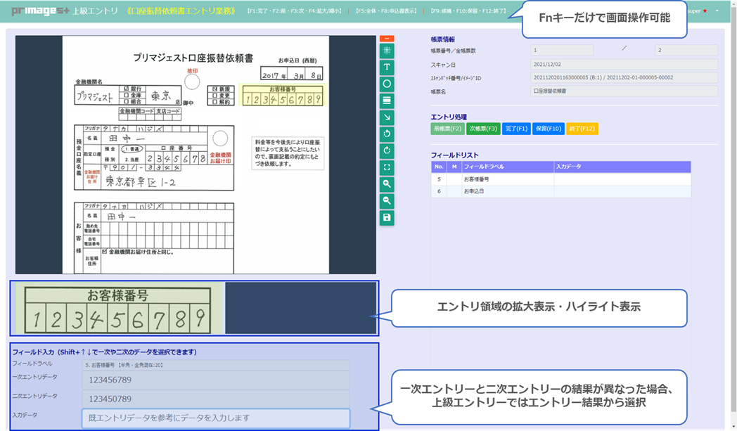 - 帳票全体イメージとは別に、エントリー対象項目を拡大表示したり、ファンクションキーによる操作を可能とするなど、オペレータが使いやすい業務画面を提供します。