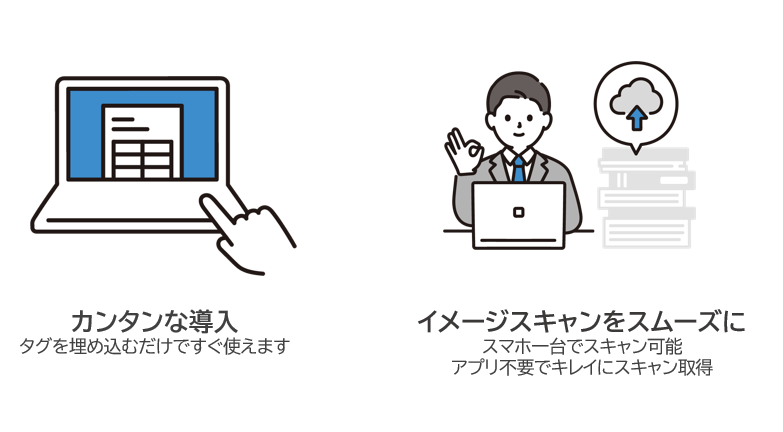 - iOSアプリをインストールすることなく、QRコード等から専用アプリを起動することで、スムーズかつ高解像度のスキャンが可能になります。