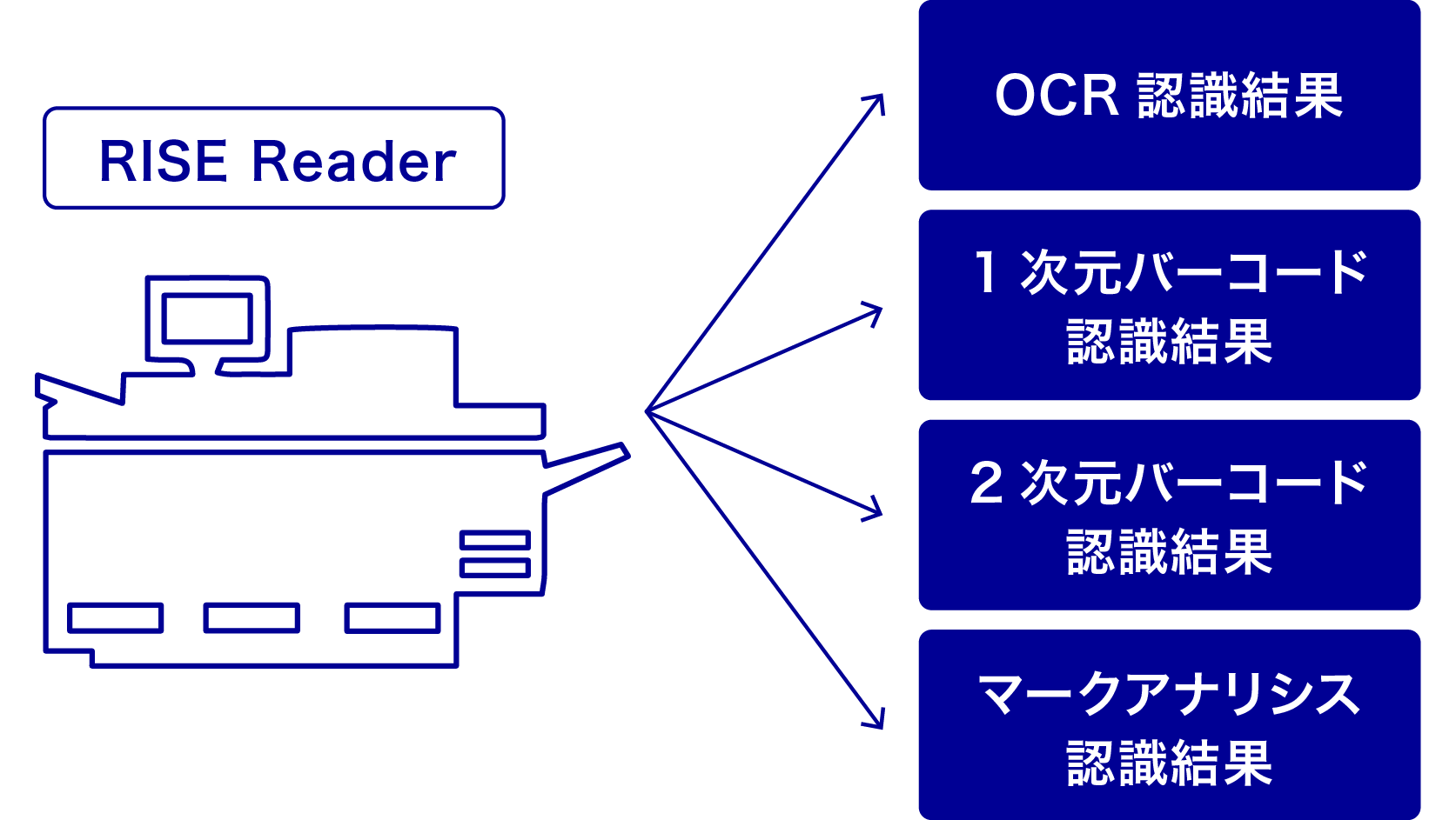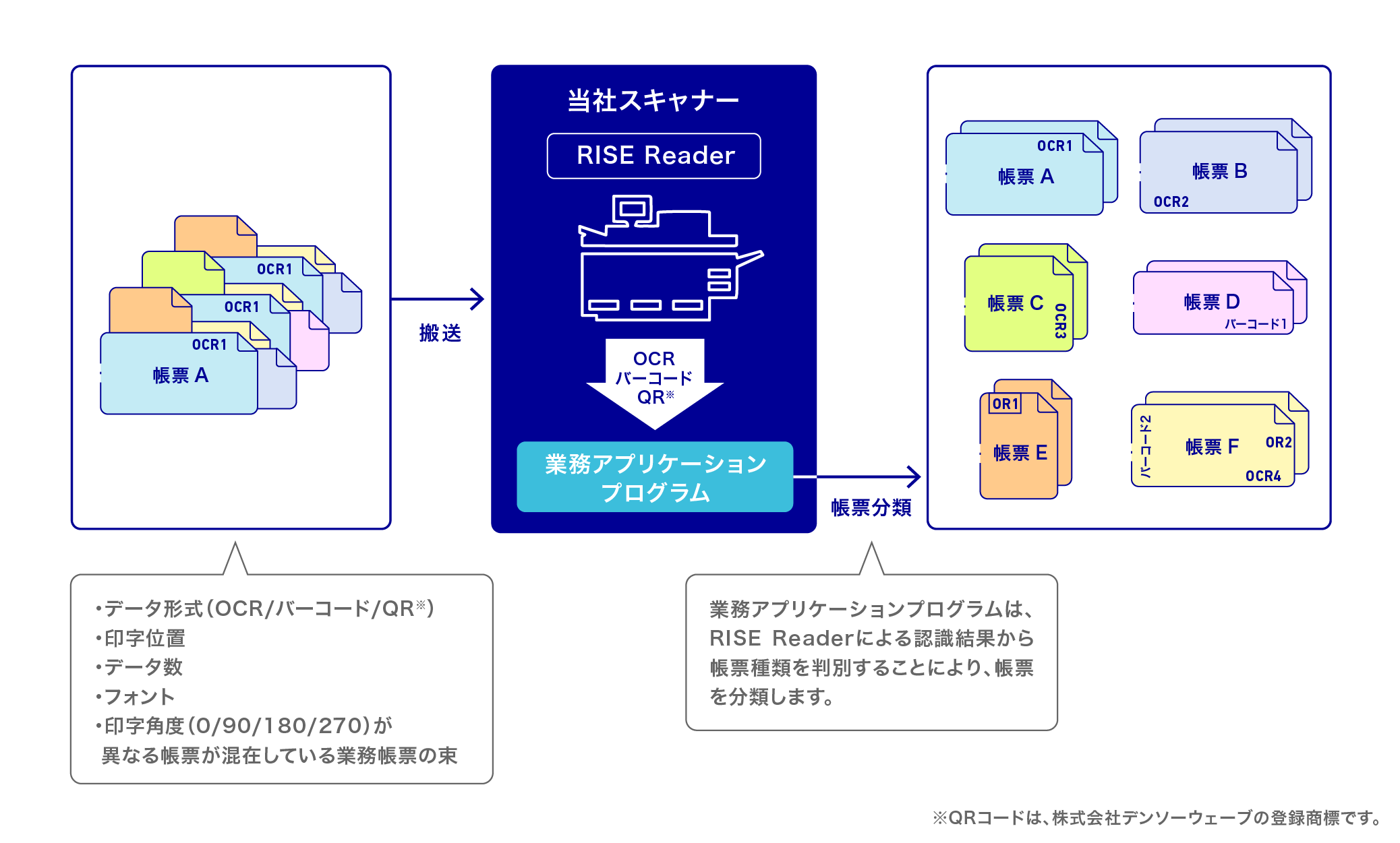 本製品は、当社スキャナ上において、帳票搬送時に帳票上のOCR文字およびバーコード(1次元、2次元)を