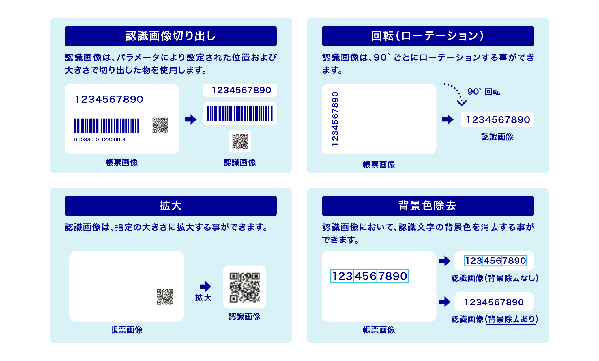 - 認識画像において指定の画像処理を行う事により、帳票の品質に影響を受ける事なく、より高い認識精度を実現する事ができます。また、リアルタイム処理に必要な認識速度の向上も実現しています。