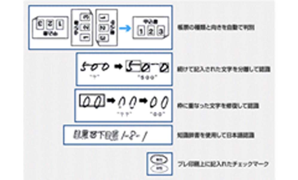 - 種類の混在した帳票や回転した帳票の読み取りが可能です。連続して書き綴られている文字や枠にはみ出した文字などについても、高精度な読み取りが実現可能です。