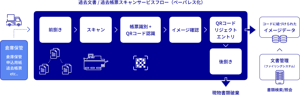 当社では、お客様のニーズに合わせ、高速スキャナ―はもとより、これまで培ってきたデジタル化のノウハウ(前捌き~スキャン~文書種類/帳票種類識別+QRコード認識~イメージ確認~エントリなど)をベースとした、文書電子化サービスを展開しております。これまで数々の企業にシステム導入した高い経験値を活かし、業務に必要な機能をテンプレート化した文書管理(ファイリング)システムを構築し、低価格かつ多機能・高機能なシステムをスピーディにご提供することが可能です。