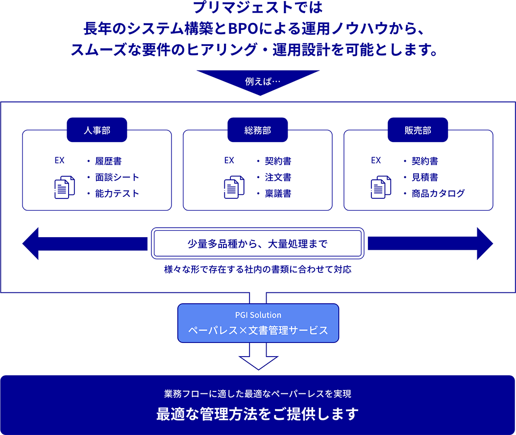 プリマジェストのデジタル化サービスは、長年のシステム構築とBPOによる運用ノウハウから、スムーズな要件のヒアリング・運用設計を可能とします。対象範囲についても販売部門関連文書・人事部門関連文書・総務部門関連文書を始めとした社内のあらゆる文書に対応し、処理量については超大量短納期から少量多品種まで、お客様がペーパレスを推進したい要件にあわせたサービスをご案内することが可能です。