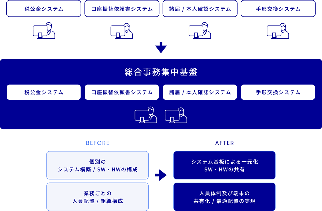 銀行業界の事務系バックオフィス業務についてはそれぞれの業務ごとにシステムを構築し、人員配置がおこなわれてきましたが、