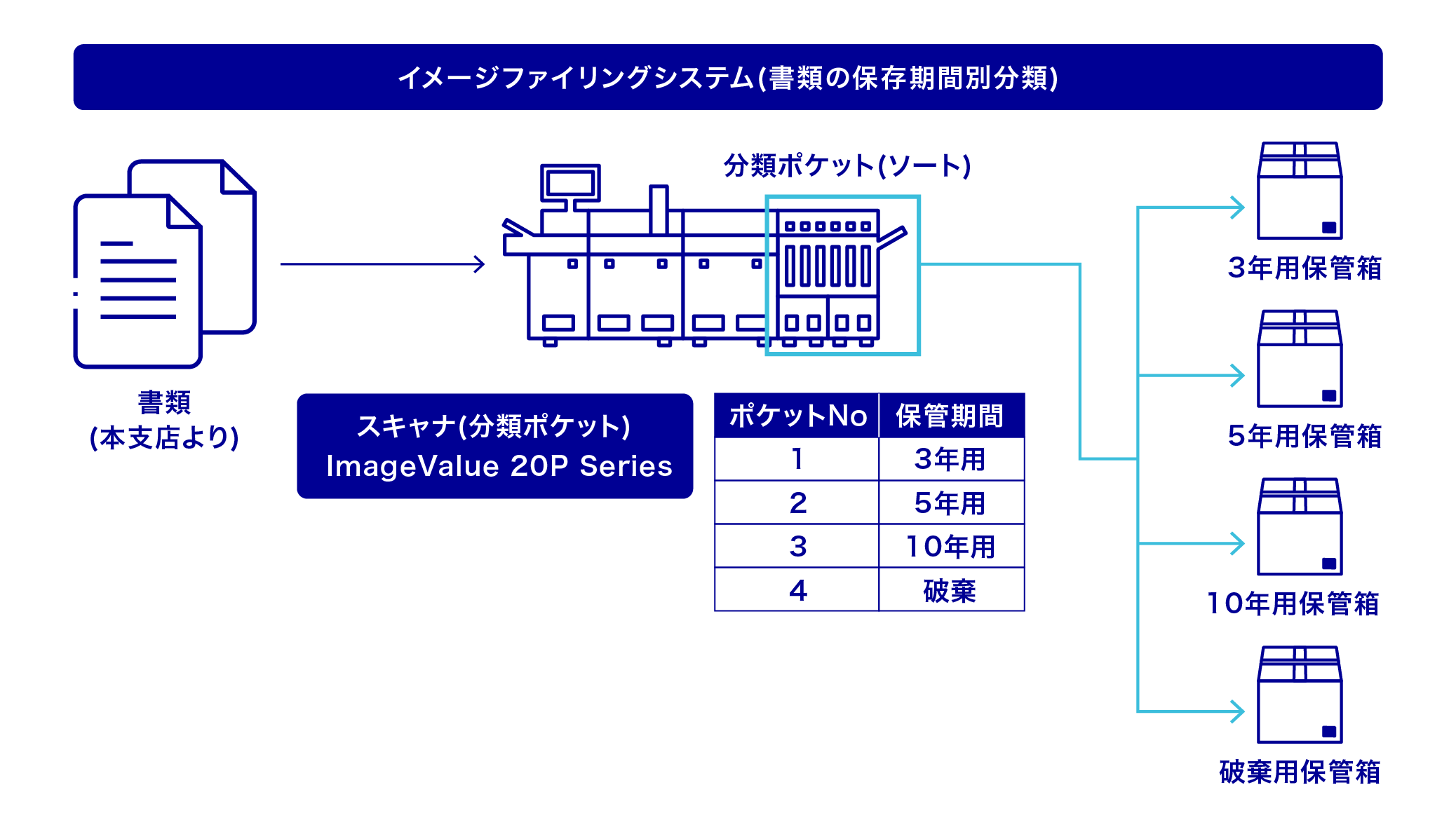 | 導入後 | 機械が、保存期間を自動的に判断して分類します。機械による分類なので、高速分類が可能で、分類ミスがなくなります。 | 事務センターに集中する事で、本支店での個別作業はなくなります。 | 事務センターでの集中処理により、大小大量の混在帳票を高速に保存期間別分類する事ができます。 | イメージファイリング(汎用エントリー/Web照会)へ、イメージファイルを連携する事で、日常業務で使われるさまざまな書類を「電子データ」として一元管理します。 |