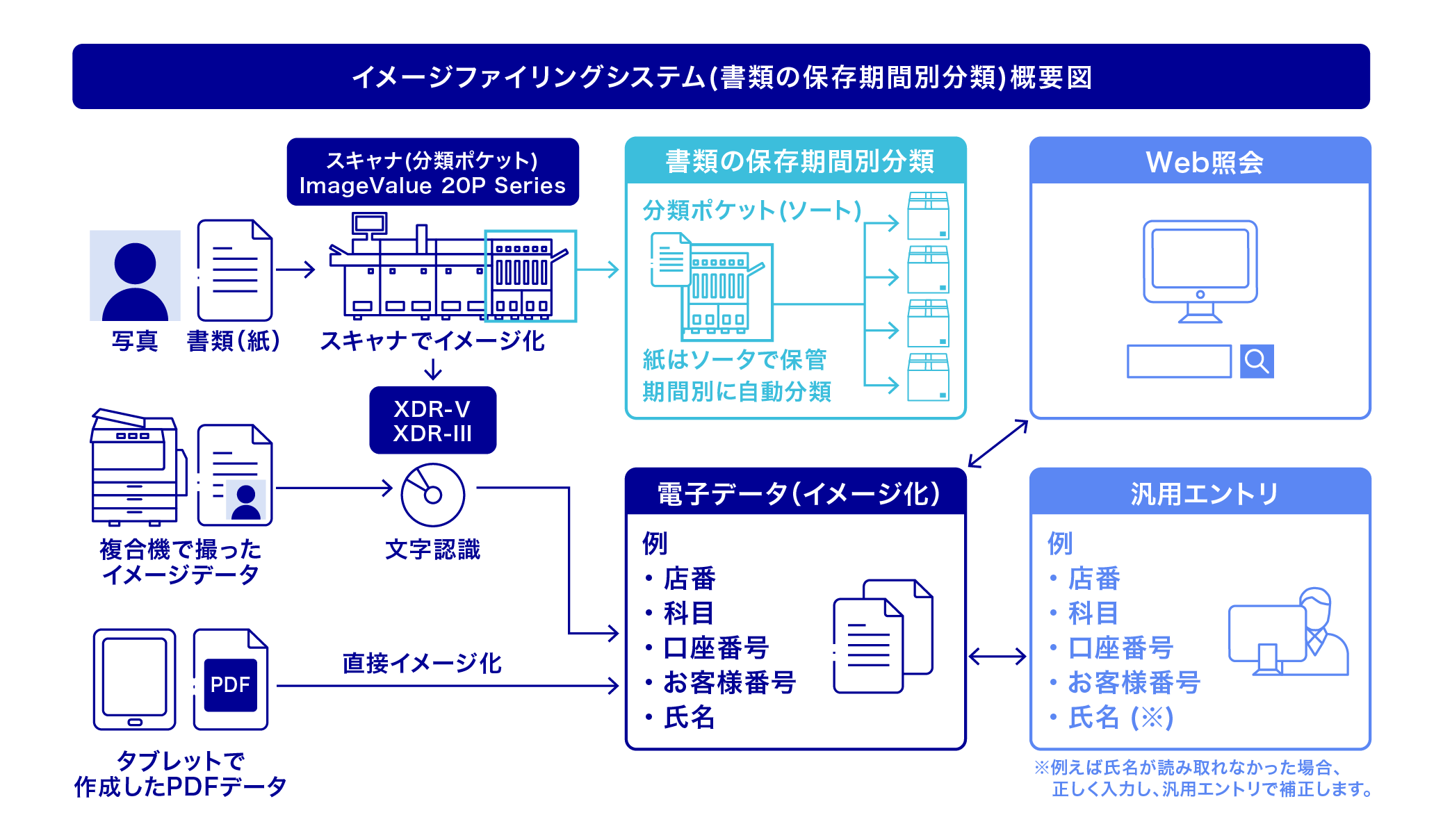 イメージファイリングは、日常業務で使われるさまざまな書類からイメージ化(電子化)して情報を抽出し、