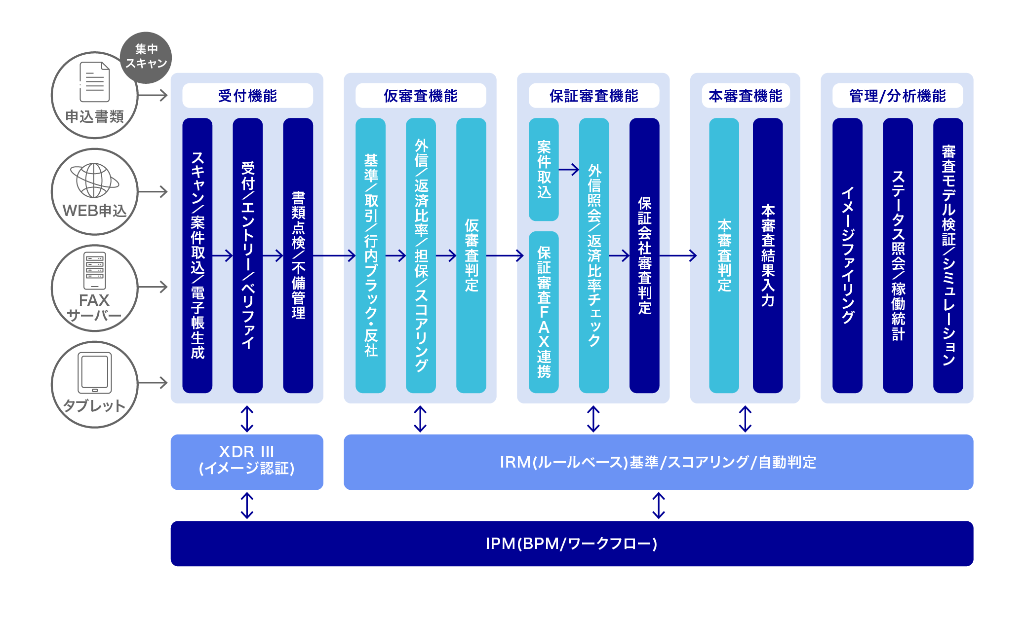 住宅ローン審査イメージワークフローには、プリマジェストがもともと有していたイメージデータ、イメージワークフロー、ルールエンジンだけでなく、金融業のお客様の各種システムを提供してきた中で、蓄積した経験や業務ノウハウなどをフルに適用しています。