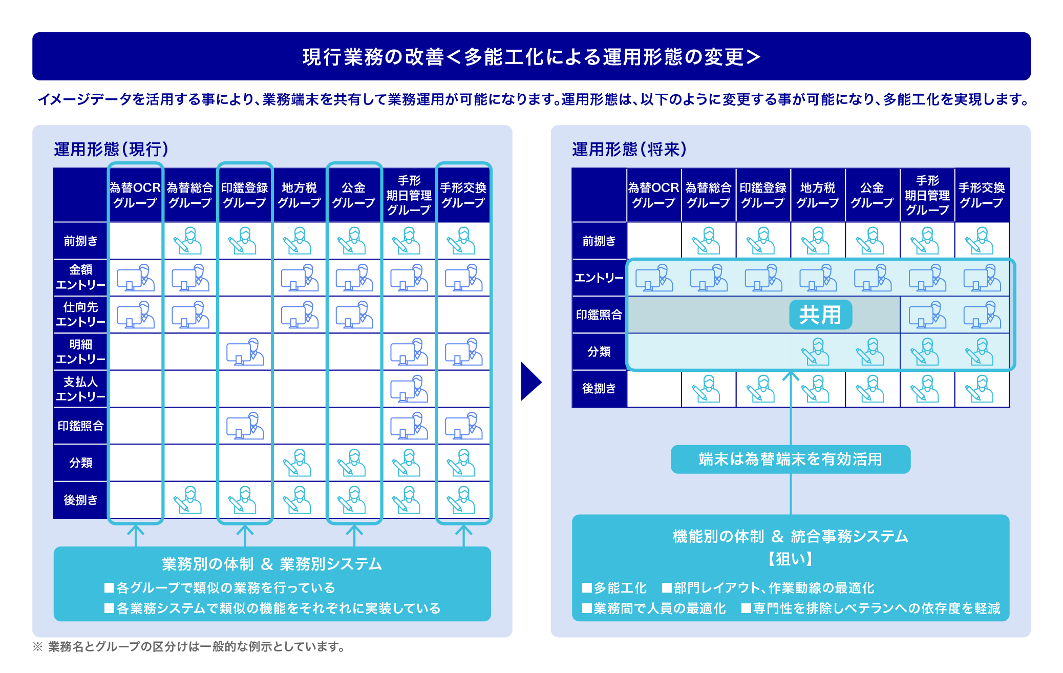 業務間でリソースを共有する事で導入・運用コストを抑制し、事務センター全体の最適化を実現。業務を作業特性によって分業化し、無駄のない人員運用体制を構築する事が可能です。後方事務の効率化、事務部門のコストセンターからプロフィットセンターへの転換、情勢・環境変化への迅速かつ柔軟な対応を実現します。