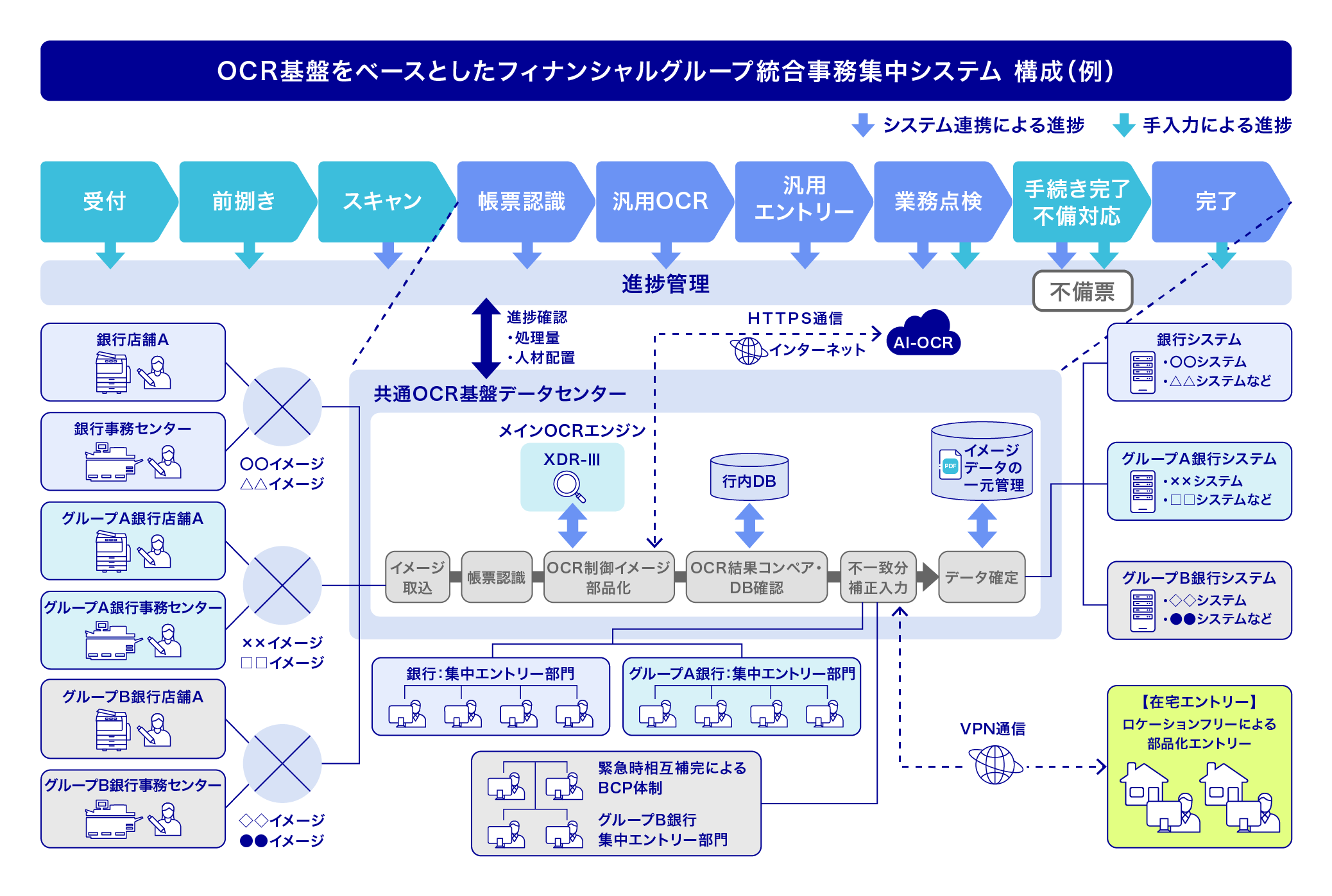 システムの共通基盤はOCR技術をベースに構築。高速・中速スキャナによる混在処理、イメージ処理技術による業務固有情報(仕向先、委託先など)入力の自動化・専門性軽減、文字認識によってエントリー補助を実現しセンター事務を効率化。業務の分業化と平準化により、ノウハウの属人化を排除した運用最適化を実現します。
