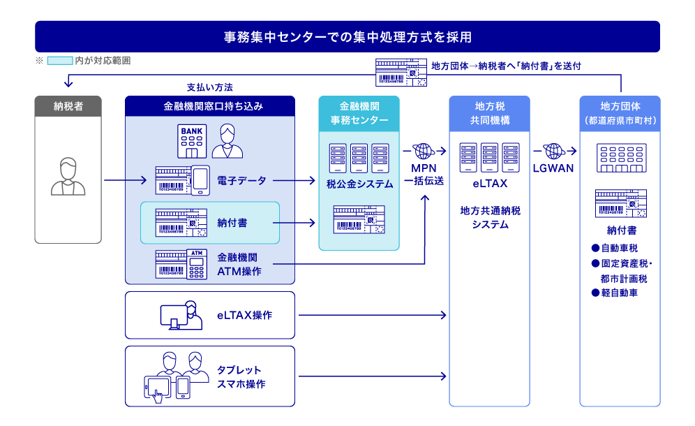 金融機関の窓口収納においては、金融機関がQRコードを読み取り、eLTAX(地方税共通納税システム)を経由して、自治体に対し収納データを送信する事になります。