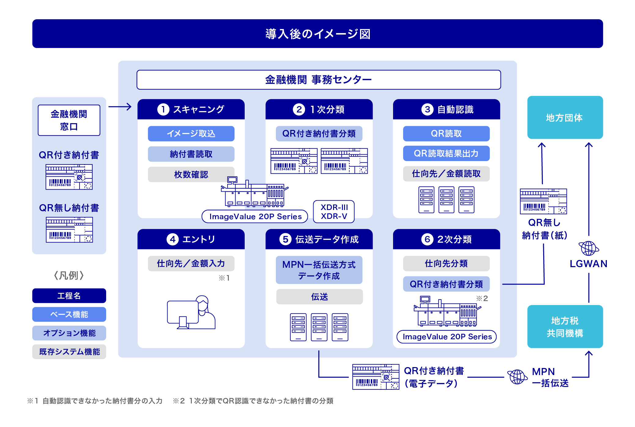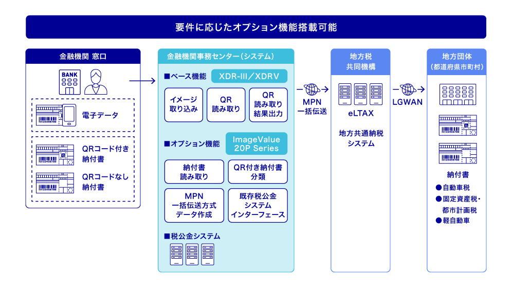 QRコードの読取機能をシステムとして導入するだけでなく、勘定系システムやeLTAX(※)との連携まで含め、地方税統一QRコードによるスムーズな収納対応、さらには対象税目の拡大等お客様の課題別に業務フローを構築するサポートまでご提案が可能です。