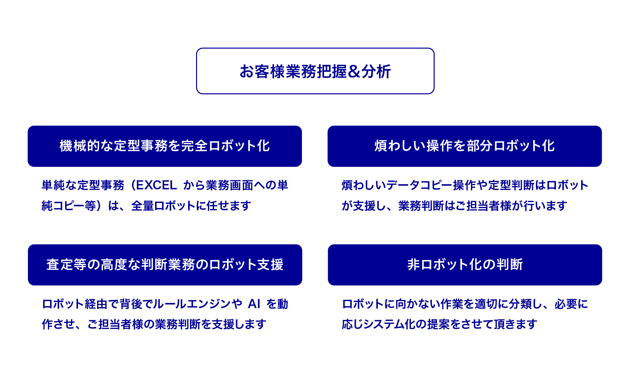 弊社は、長年実施してきたBPM提案のノウハウを生かし、お客様の現行業務プロセスからどのようなものがRPA化に適切か否かを抽出し、最適なRPAソリューションを提供します。