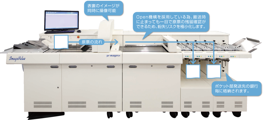 Openな搬送機構を採用しているため原票を傷める事なく搬送する事ができます。また、万一止まった場合でも一目で書類の残留確認ができるため、紛失リスクを極小化する事が可能です。