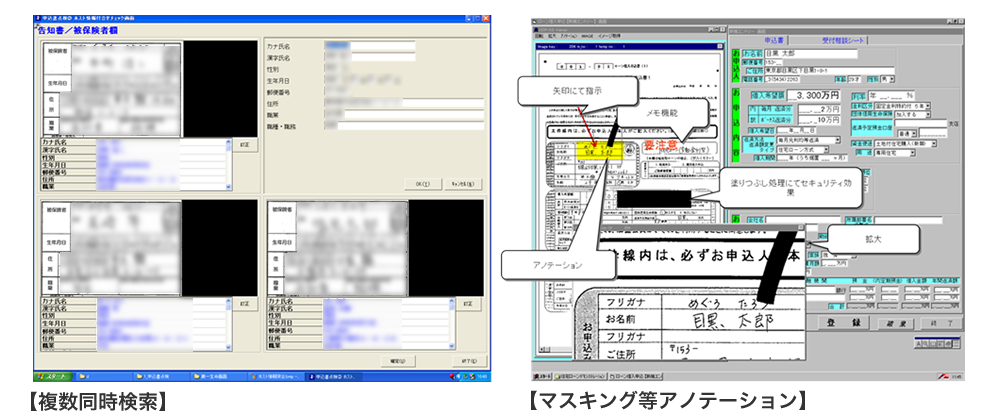 お客様からの状況確認のための問い合わせも、コールオペレータがイメージ検索し、現在のステータスが確認できるため、お客様への回答が即時可能です。 閲覧者の権限レベルに応じてアノテーション機能によってマスキングも可能で、セキュリティを保ちつつ、作業効率アップを同時に実現します。