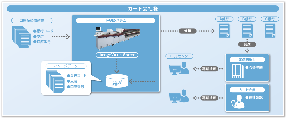 カード会員の引き落とし口座振替依頼書を銀行へ発送する際の分類業務を効率化いたします。