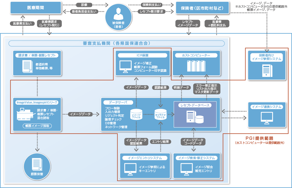イメージデータの活用により、診療報酬請求明細書(レセプト)の審査支払業務などの効率化をご支援いたします。イメージデータ化されたレセプトを文字認識処理し、イメージ参照補完エントリ(キーエントリ)による高精度コードデータ化を実現いたします。イメージデータ化されたレセプトはコードデータとともに任意検索が可能なため、データイメージを含むレセプト開示対応など、保険者向け新サービスのインフラとしても活用できます。また、レセプト以外の帳票(県単独帳票等)についても長年培ったイメージソリューション技術を駆使し、ご要望に合わせたイメージの採取/活用/保管等を実現いたします。