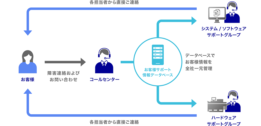 コールセンターでは、お客様からのご連絡・お問いあわせを受け付け、直ちにお客様サポート情報データベースに登録しながら担当部署に緊急連絡を行います。データベースを用いてエンジニアと共に障害情報を蓄積・共有し、サービスの向上に役立ててまいります。